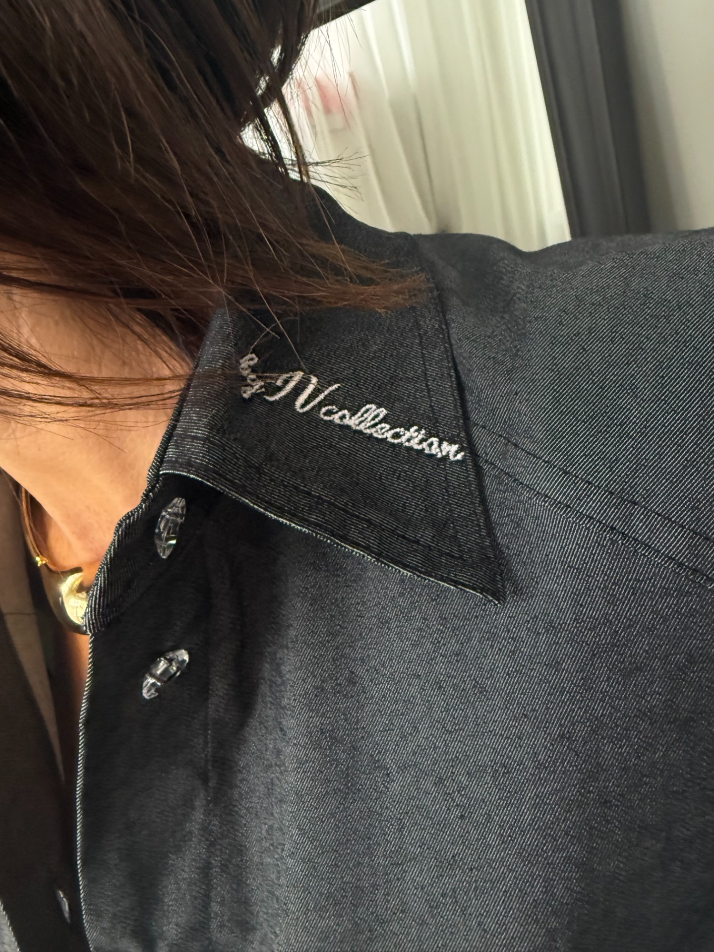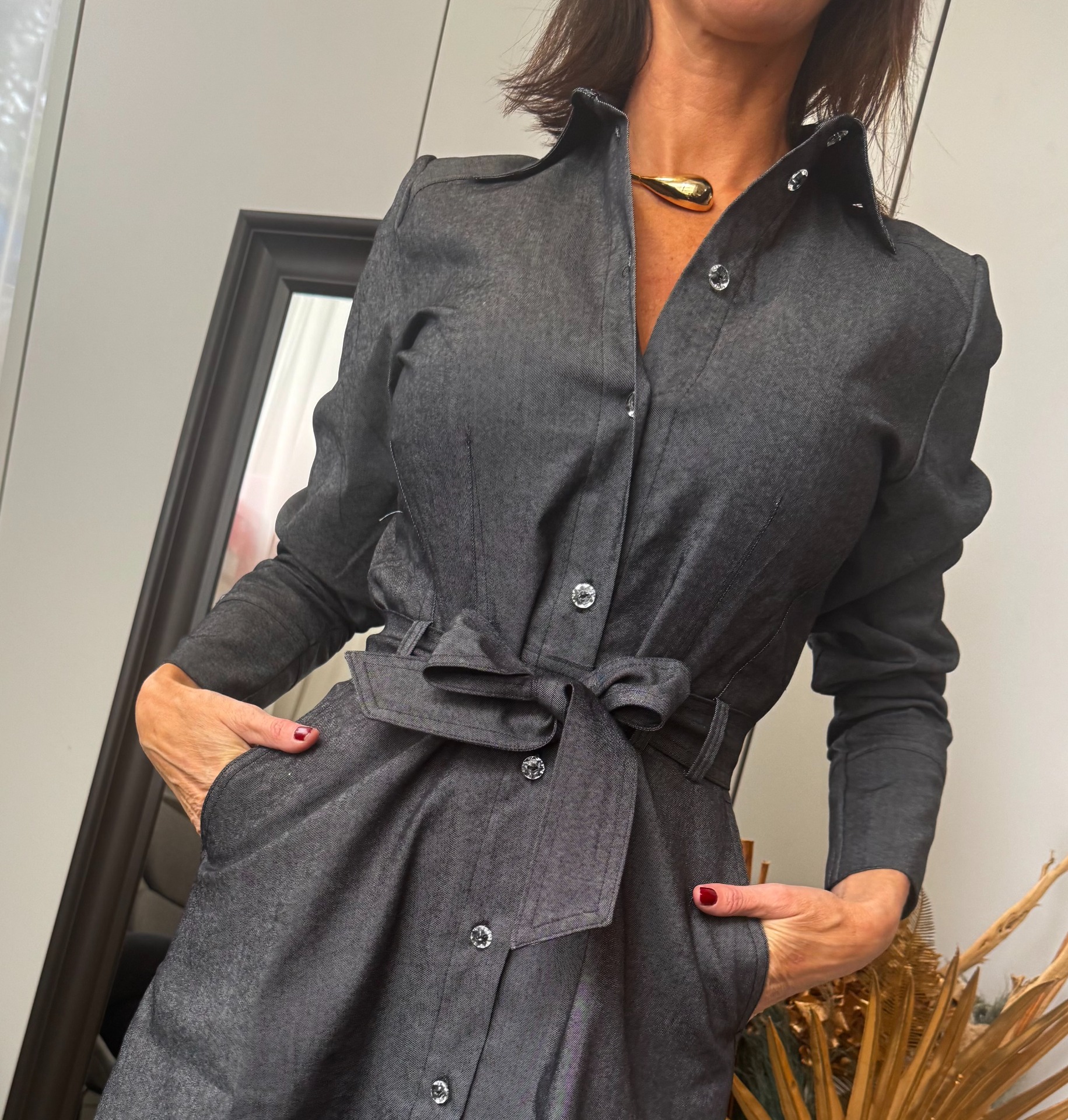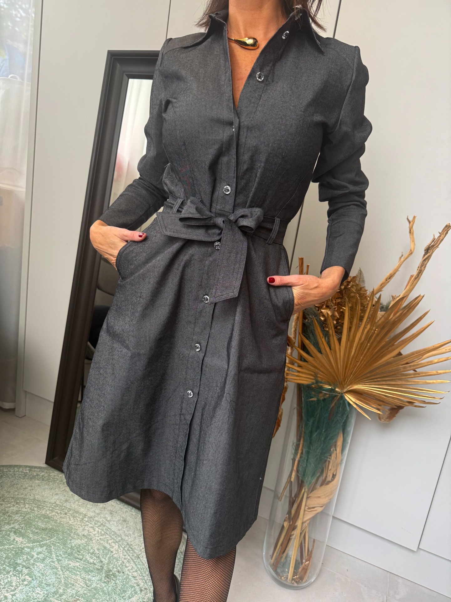 Šaty s vázáním z kolekce denim mají knoflíčky a vázání. Dlouhý rukáv a límeček. Na límečku je bílou nití vyšitý nápis by iv collection.
